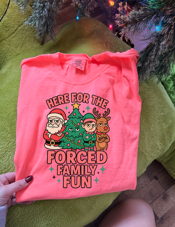 here for the forced family fun Christmas tee or sweatshirt